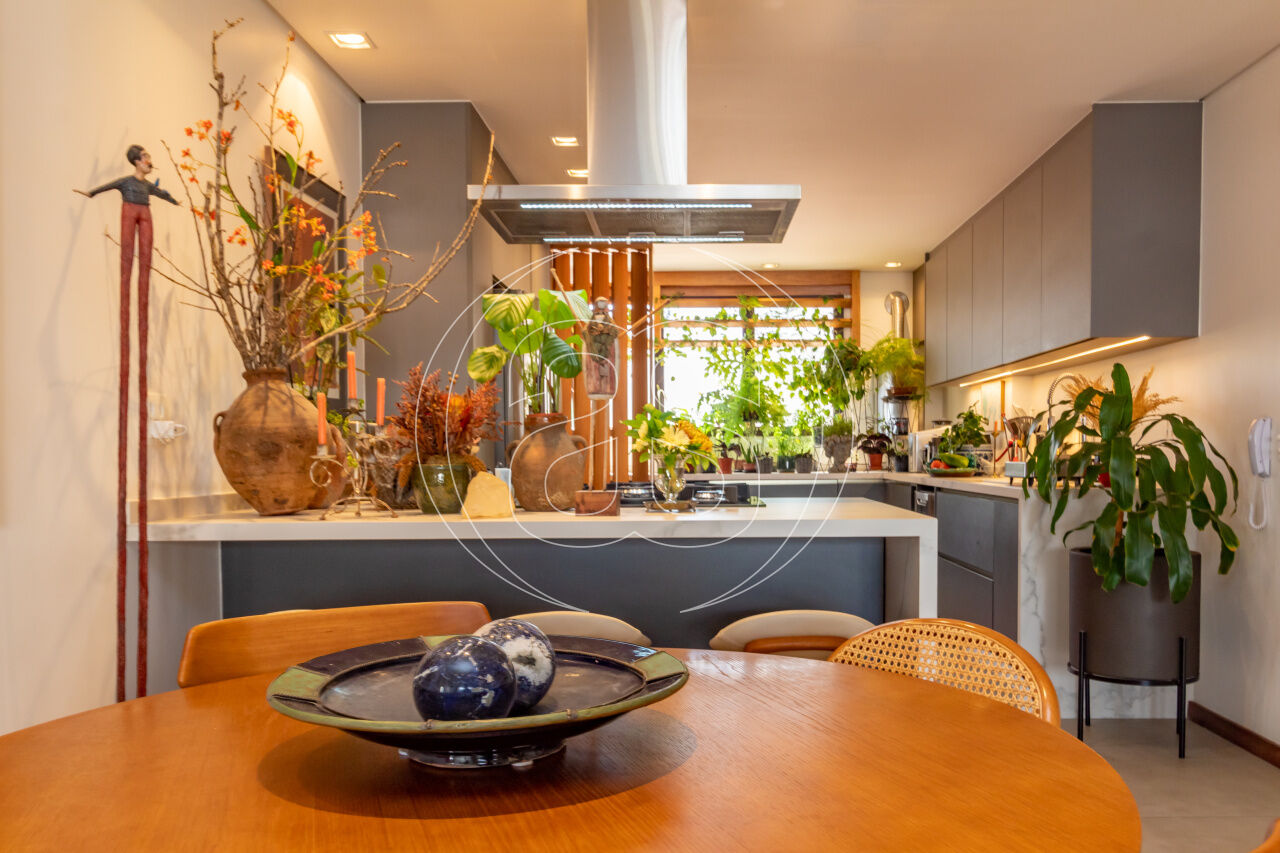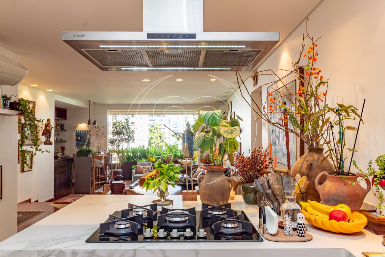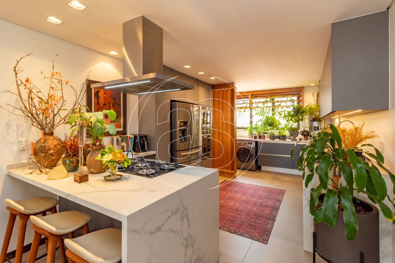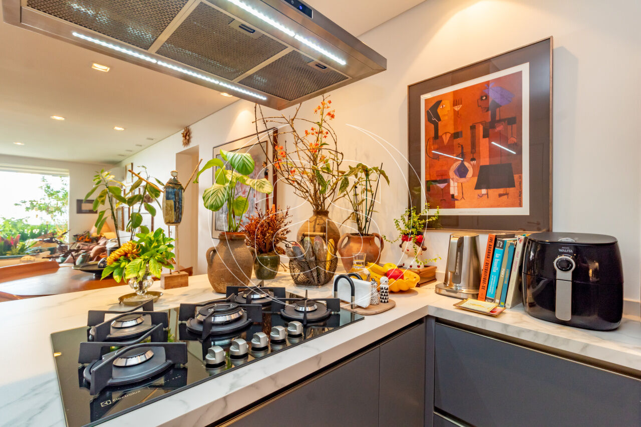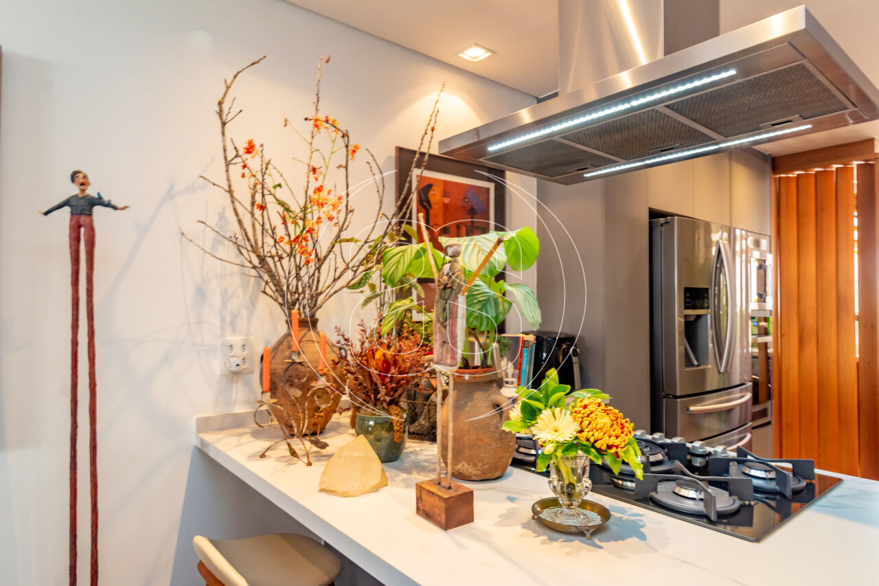 A cozinha planejada com armários Bom Tempo integra-se de forma harmoniosa à área social, criando um ambiente moderno e funcional, perfeito para receber amigos e familiares. As cortinas com automação trazem praticidade e um toque contemporâneo ao espaço.
