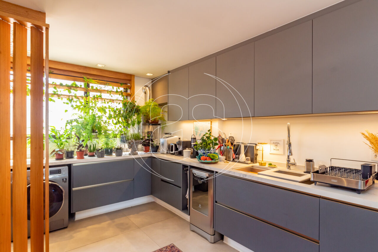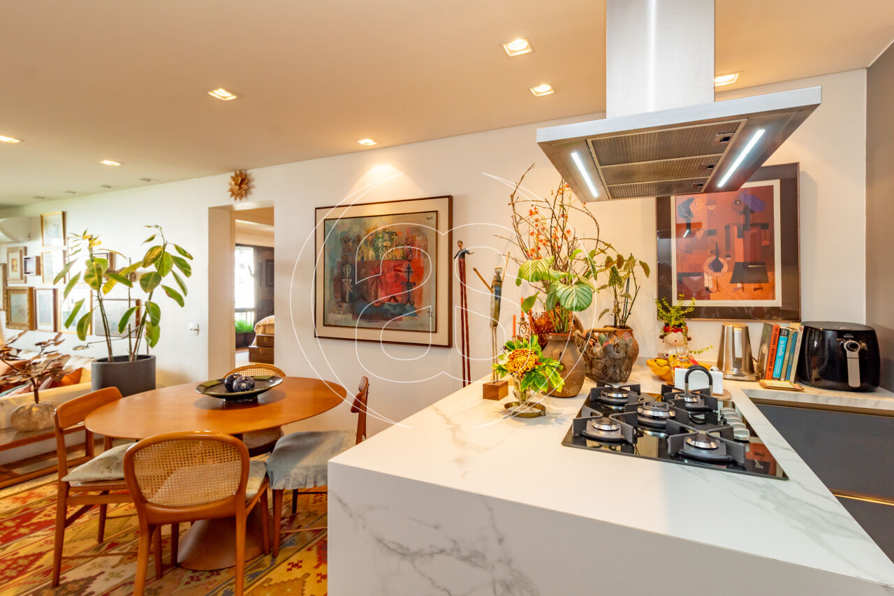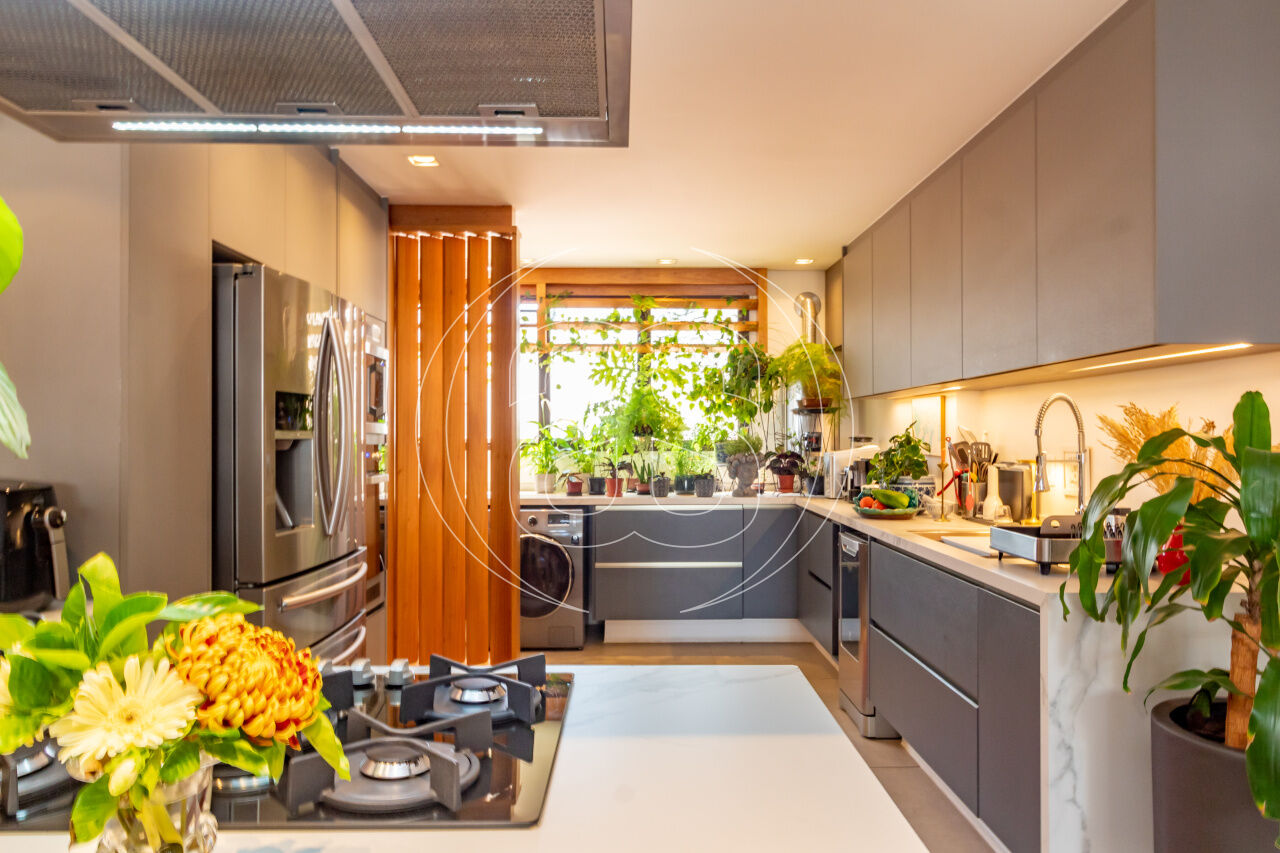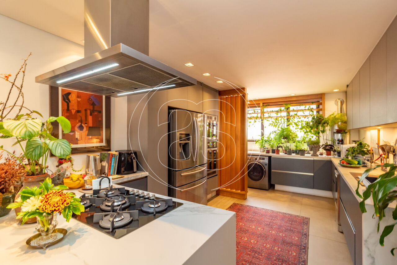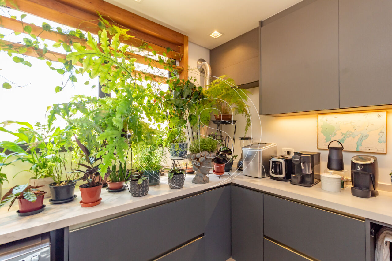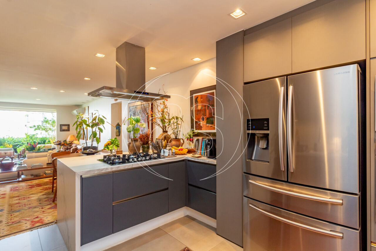 A cozinha planejada com armários Bom Tempo integra-se de forma harmoniosa à área social, criando um ambiente moderno e funcional, perfeito para receber amigos e familiares. As cortinas com automação trazem praticidade e um toque contemporâneo ao espaço.