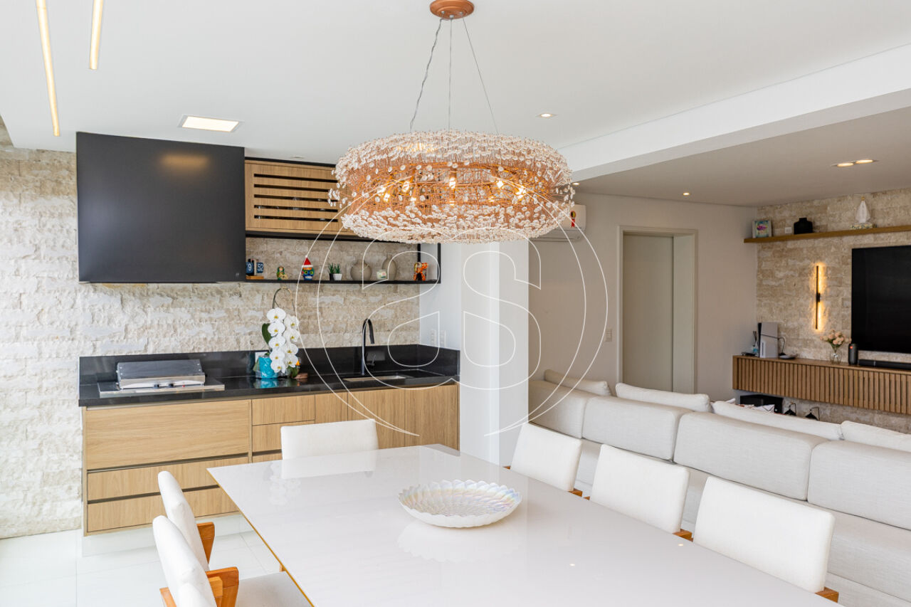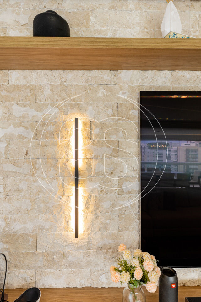 Sala de TV e área gourmet com revestimentos diferenciados, trazendo personalidade e sofisticação