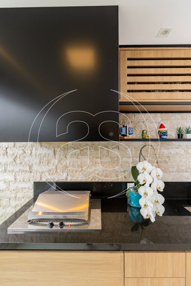 Varanda gourmet com churrasqueira elétrica, revestimentos especiais e um clima perfeito para receber amigos