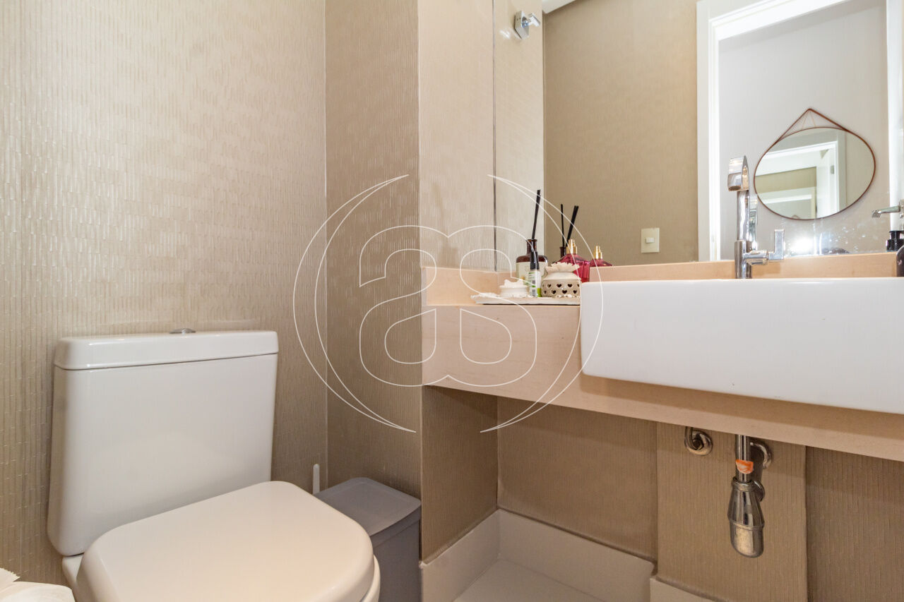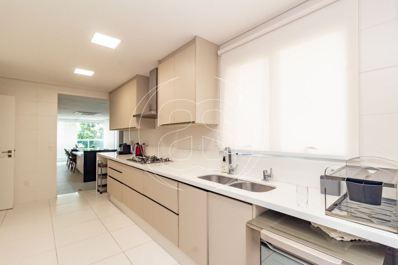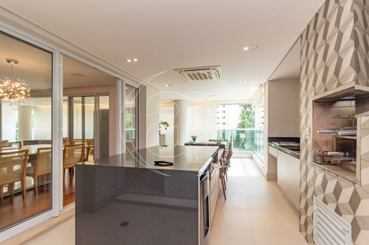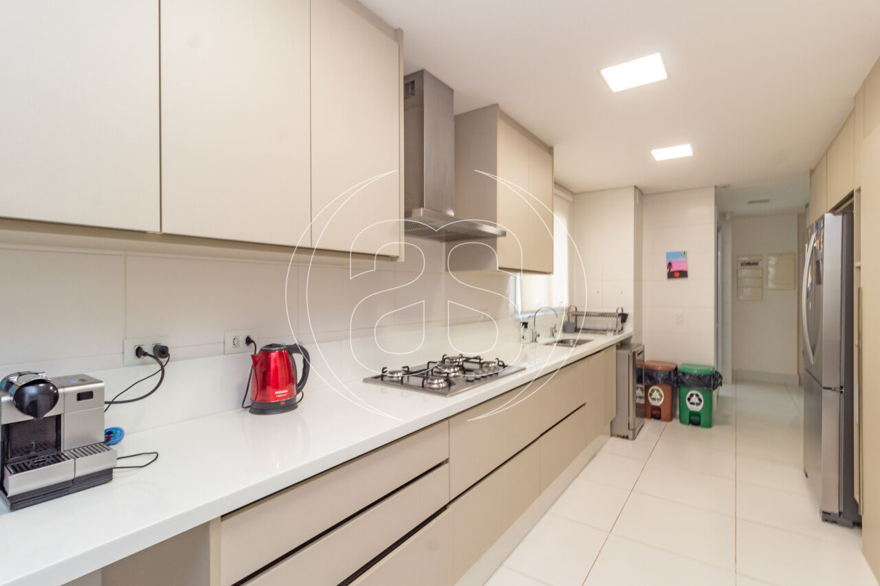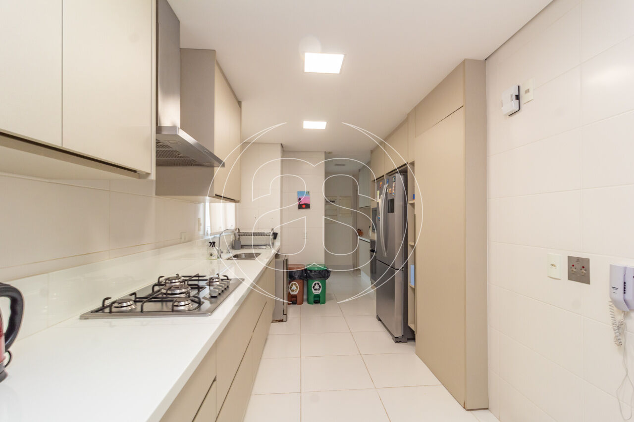 A cozinha planejada é prática e elegante, acompanhada por copa, área de serviço independente e dependência completa. O apartamento conta ainda com ar-condicionado, infraestrutura de automação, depósito privativo e 3 ou mais vagas de garagem.