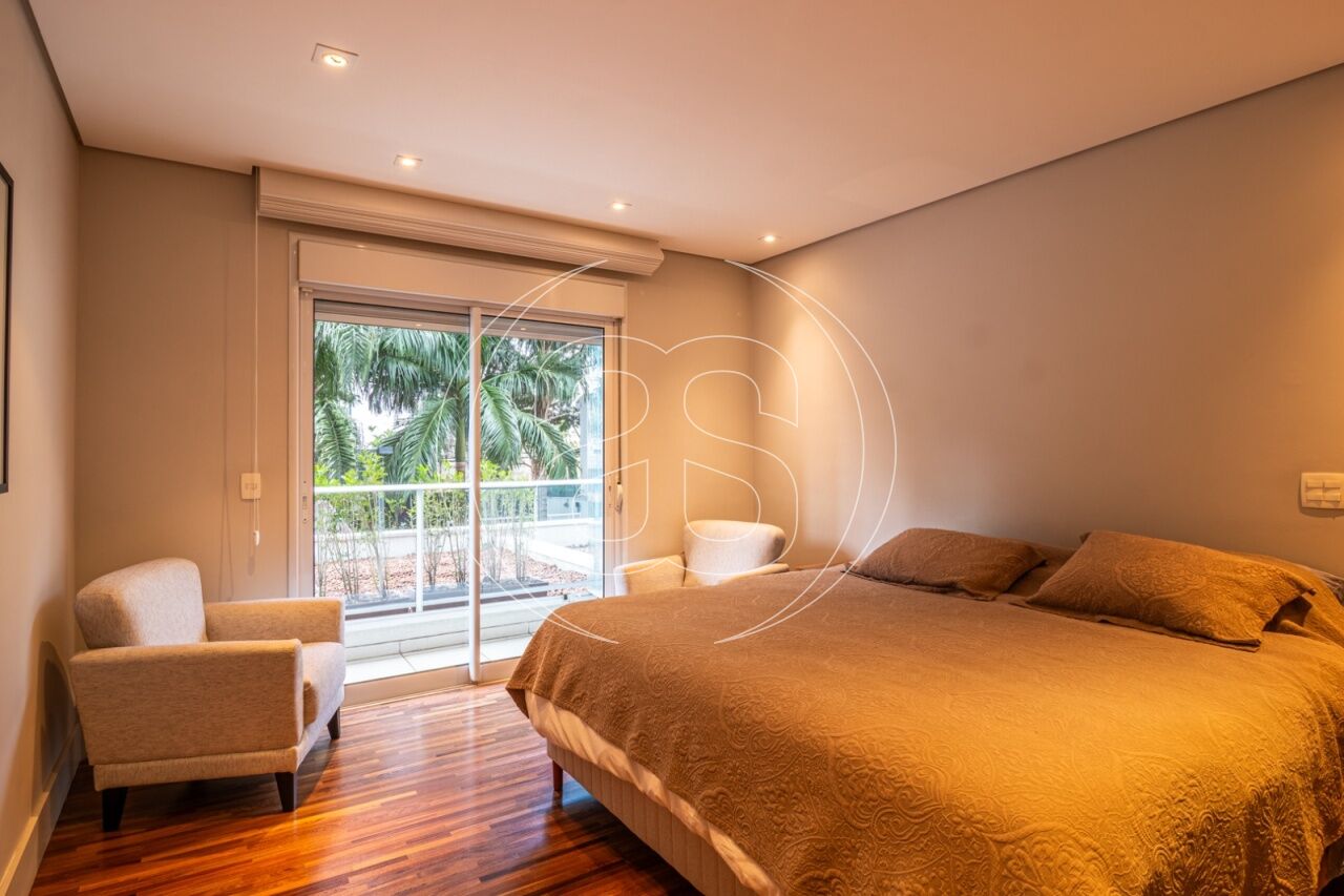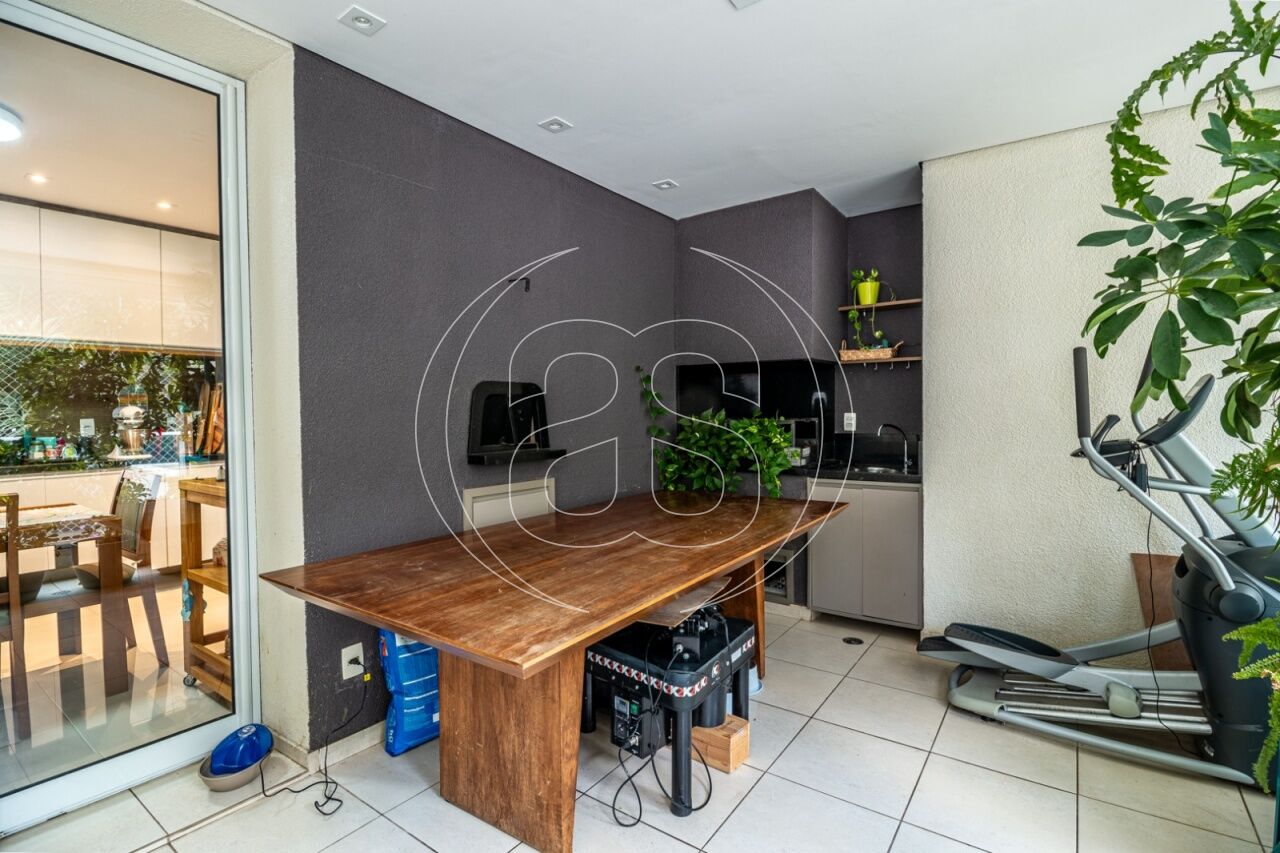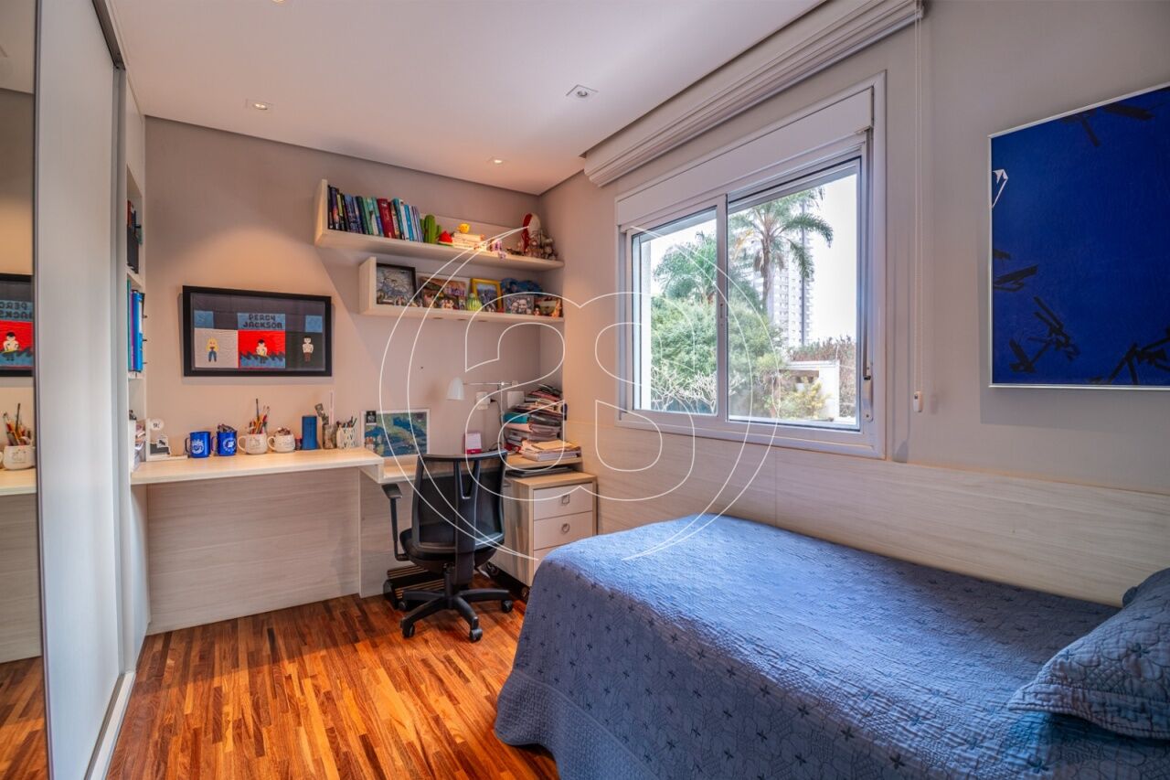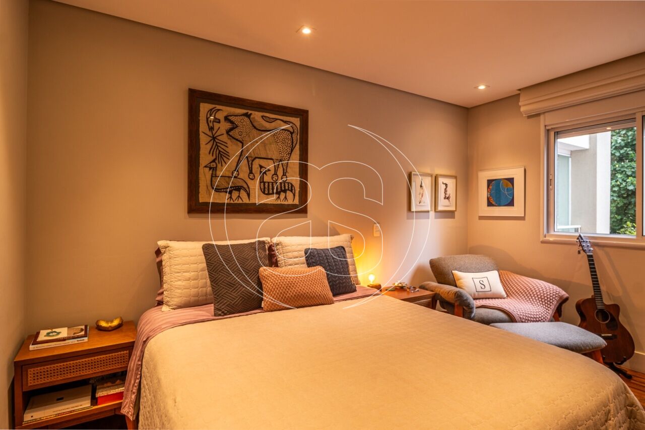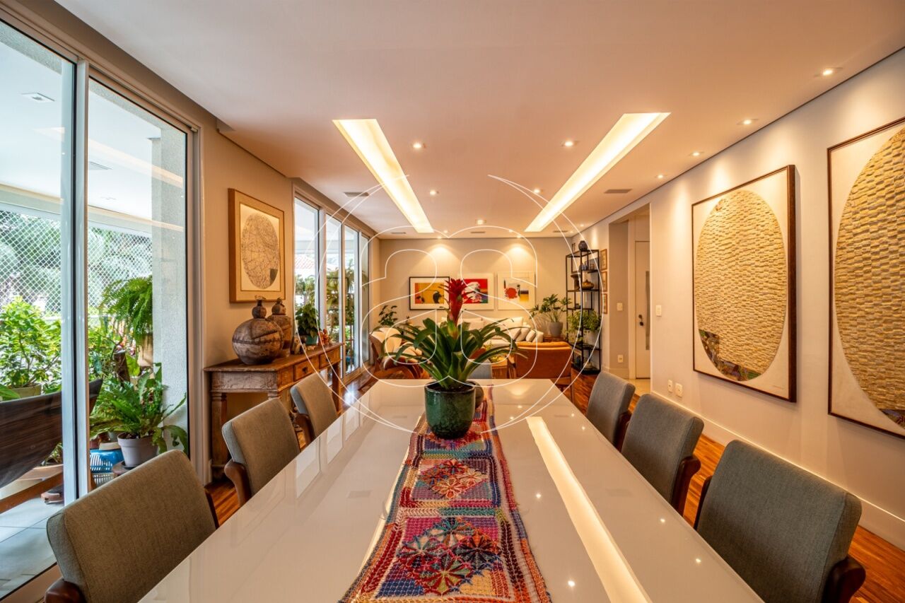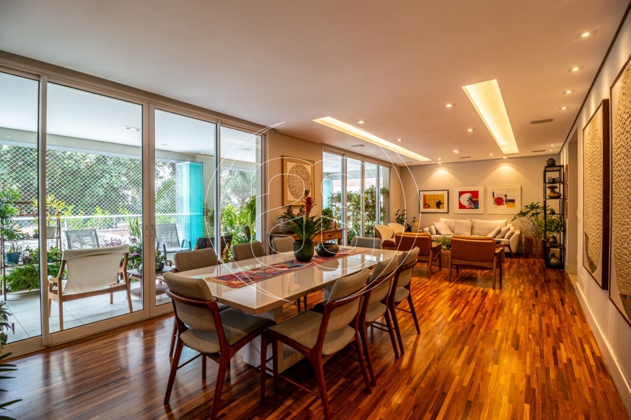 Extremamente silencioso e vista para a copa das árvores. Face norte nas varandas e em duas suítes. Decoração e iluminação de Joia Bergamo. Piso em taco palito, madeira Cumaru. Porta principal pivotante em laca. Hall do elevador, hall de entrada e lavabo com piso mármore crema marfil . Duas portas de correr em laca separando a sala de jantar da copa e o hall da ala intima. Armários sob medida (projeto Joia Bergamo) nas 4 suítes, 4 banheiros, sala de TV, copa, cozinha, lavanderia, rouparia e despensa . Alto-falantes embutidos no teto da sala e sacada com fiação instalada. Balcão em granito São Gabriel na copa, cozinha, lavanderia e churrasqueira/forno de pizza, com sistema de exaustão próprio. Armários junto à churrasqueira + depósito de lenha para o forn . Varandas totalmente envidraçadas, sistema europeu. Ar condicionado split quente e frio nas 4 suítes e sala íntima (Inverter Fujitsu). Espelhos em todos os banheiros, lavabo, closet e corredor. Persiana romana na sala íntima.