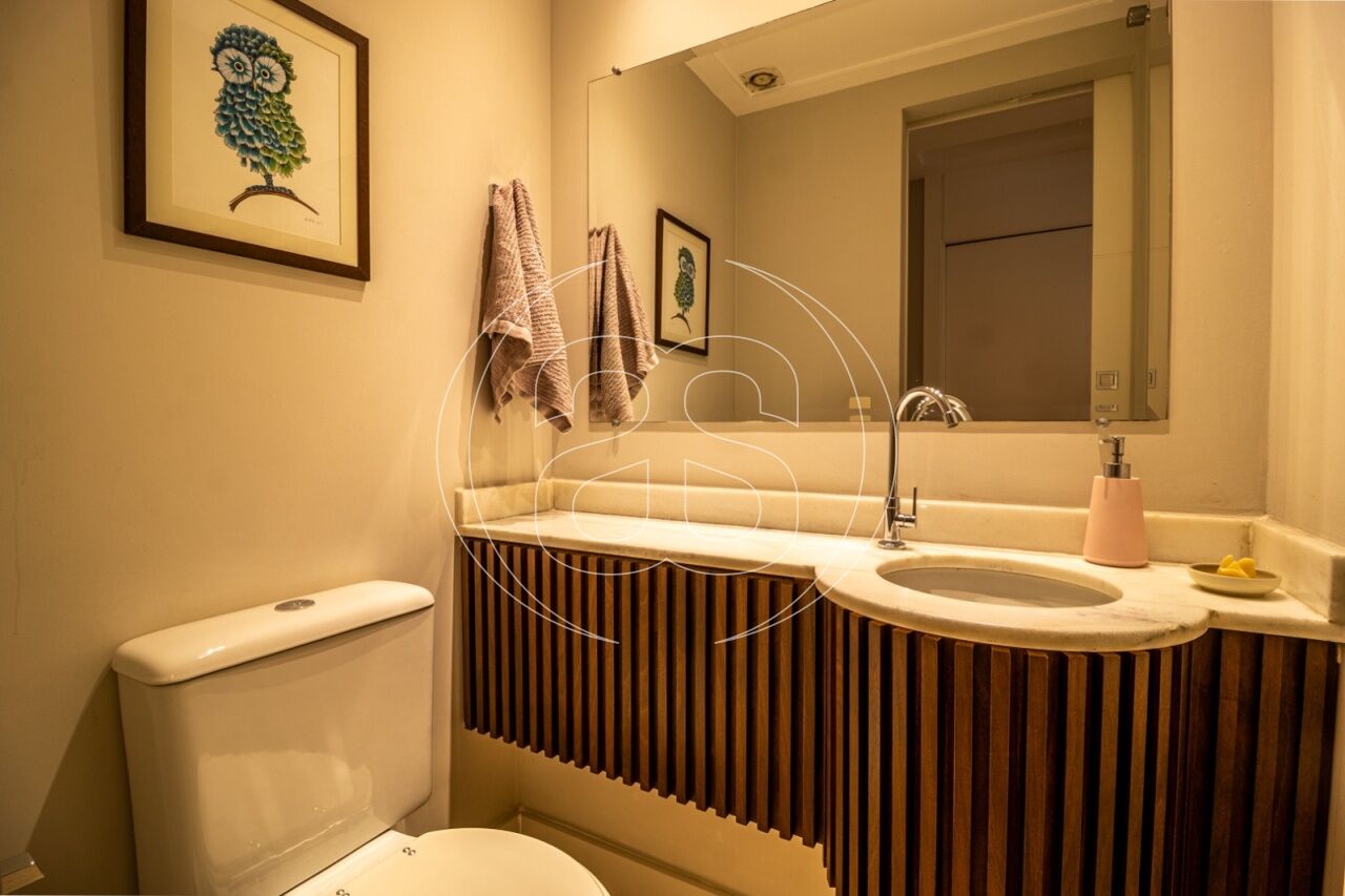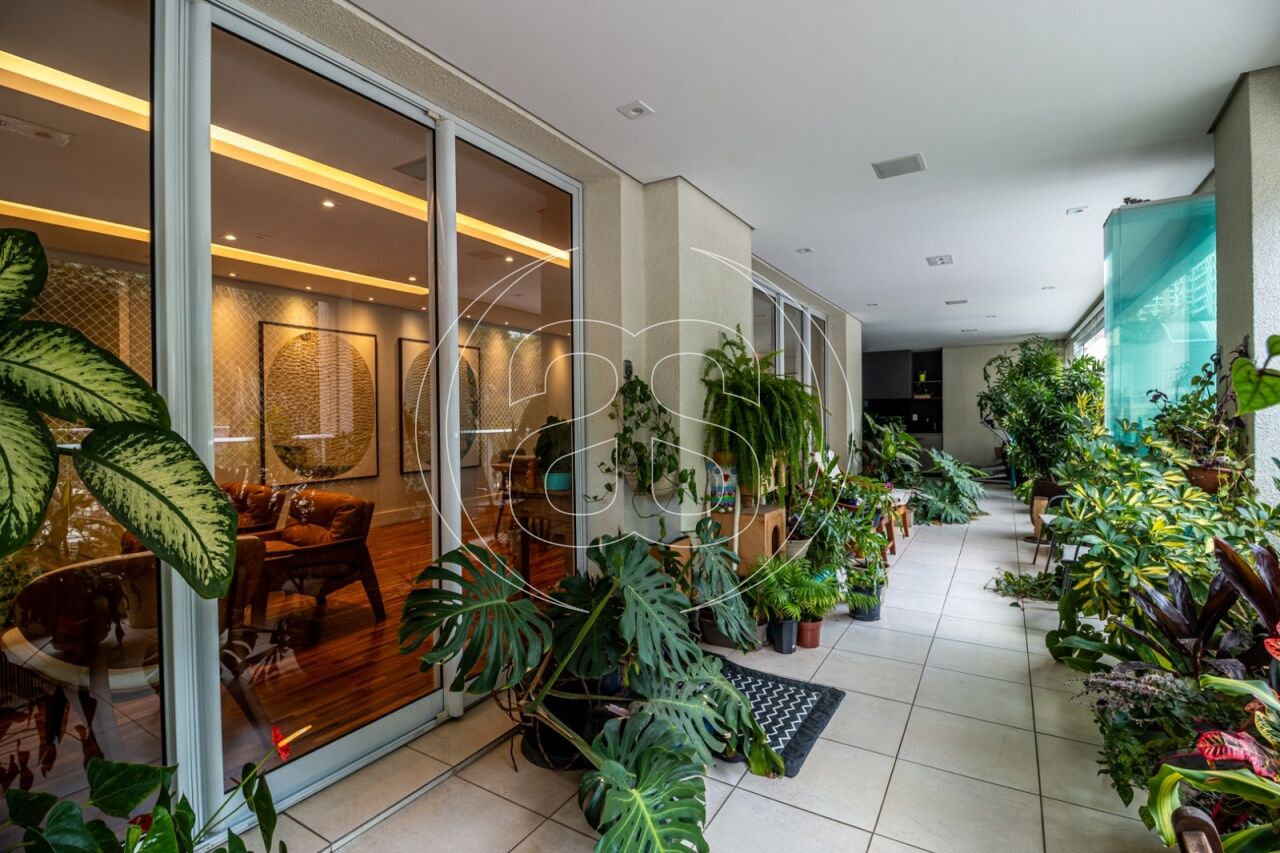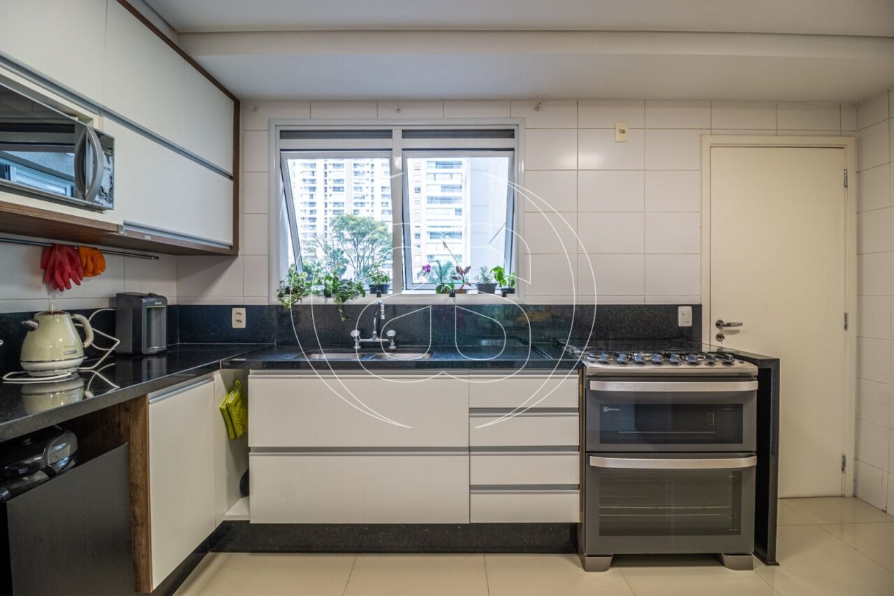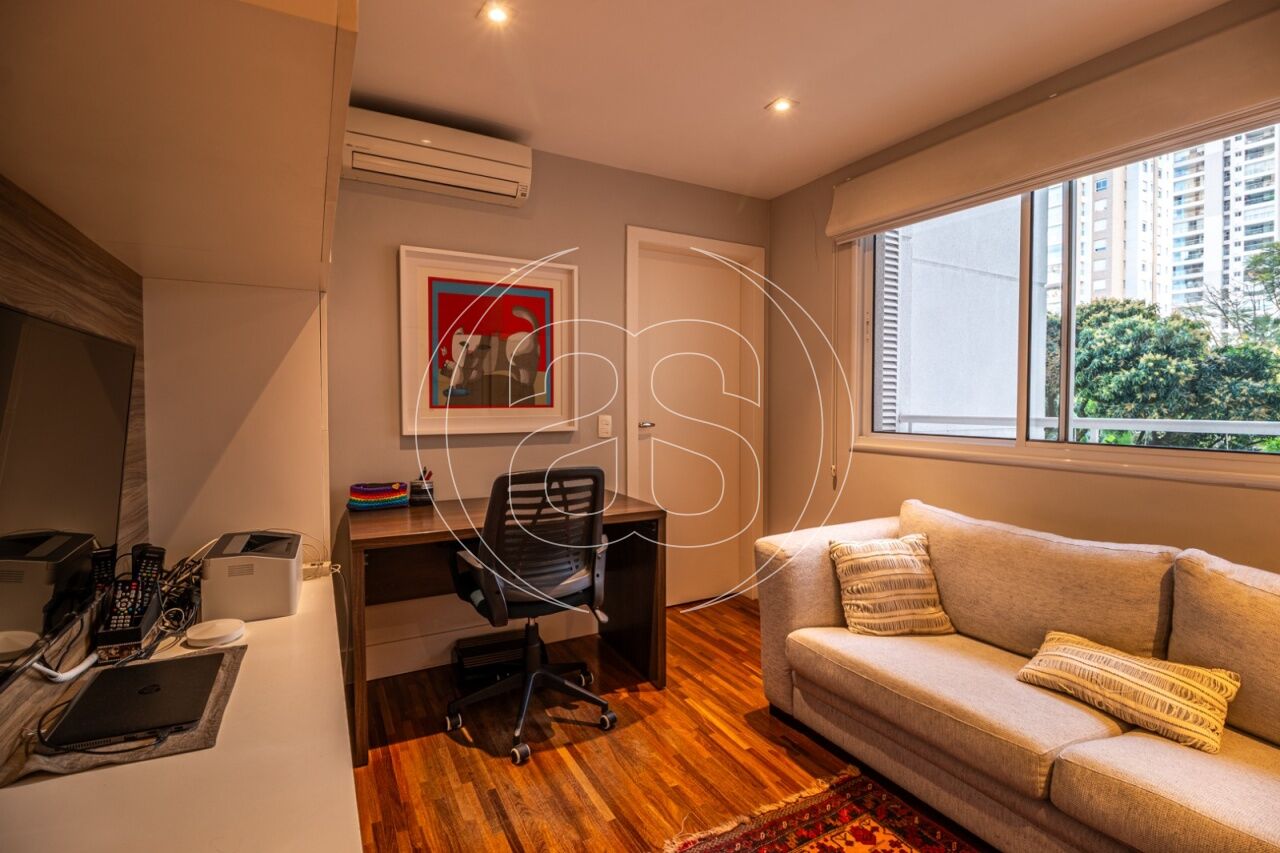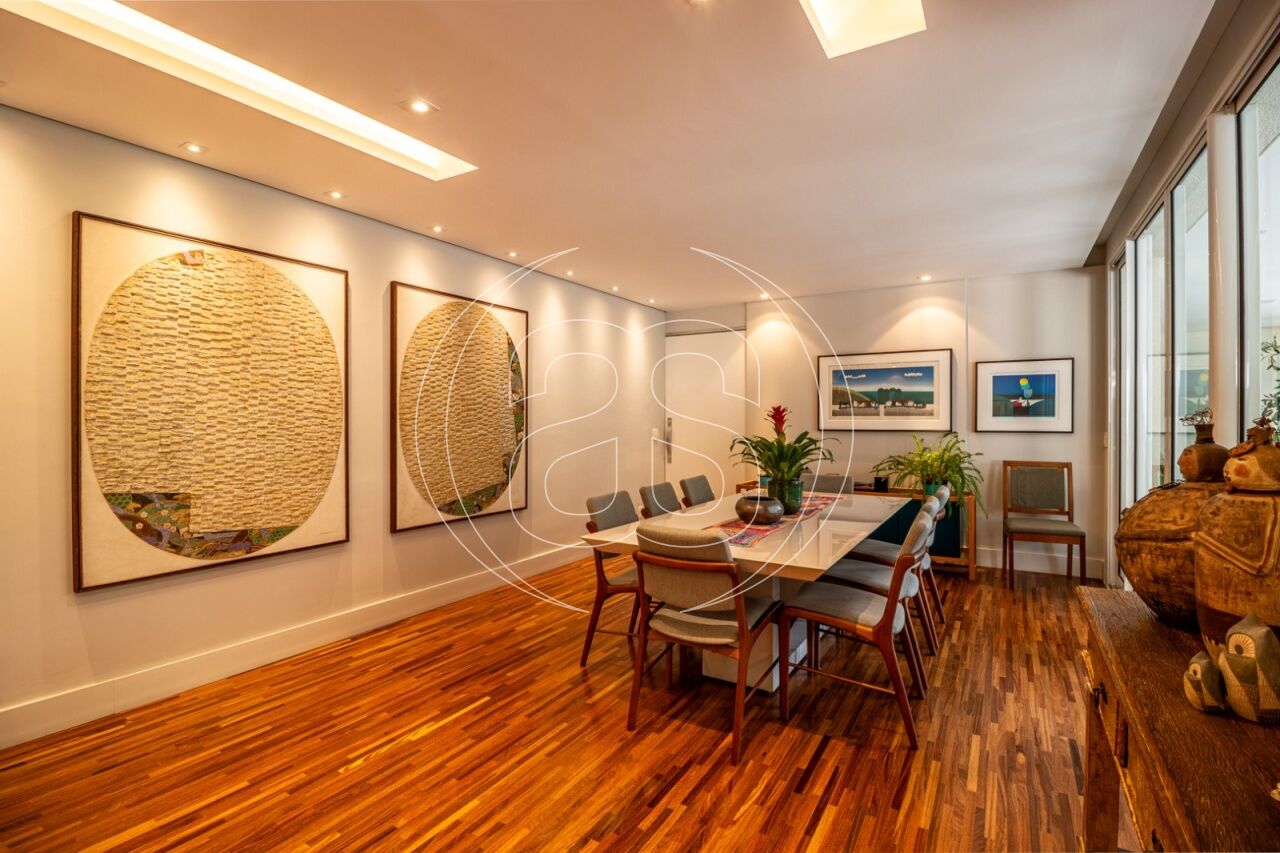 Extremamente silencioso e vista para a copa das árvores. Face norte nas varandas e em duas suítes. Decoração e iluminação de Joia Bergamo. Piso em taco palito, madeira Cumaru. Porta principal pivotante em laca. Hall do elevador, hall de entrada e lavabo com piso mármore crema marfil . Duas portas de correr em laca separando a sala de jantar da copa e o hall da ala intima. Armários sob medida (projeto Joia Bergamo) nas 4 suítes, 4 banheiros, sala de TV, copa, cozinha, lavanderia, rouparia e despensa . Alto-falantes embutidos no teto da sala e sacada com fiação instalada. Balcão em granito São Gabriel na copa, cozinha, lavanderia e churrasqueira/forno de pizza, com sistema de exaustão próprio. Armários junto à churrasqueira + depósito de lenha para o forn . Varandas totalmente envidraçadas, sistema europeu. Ar condicionado split quente e frio nas 4 suítes e sala íntima (Inverter Fujitsu). Espelhos em todos os banheiros, lavabo, closet e corredor. Persiana romana na sala íntima.