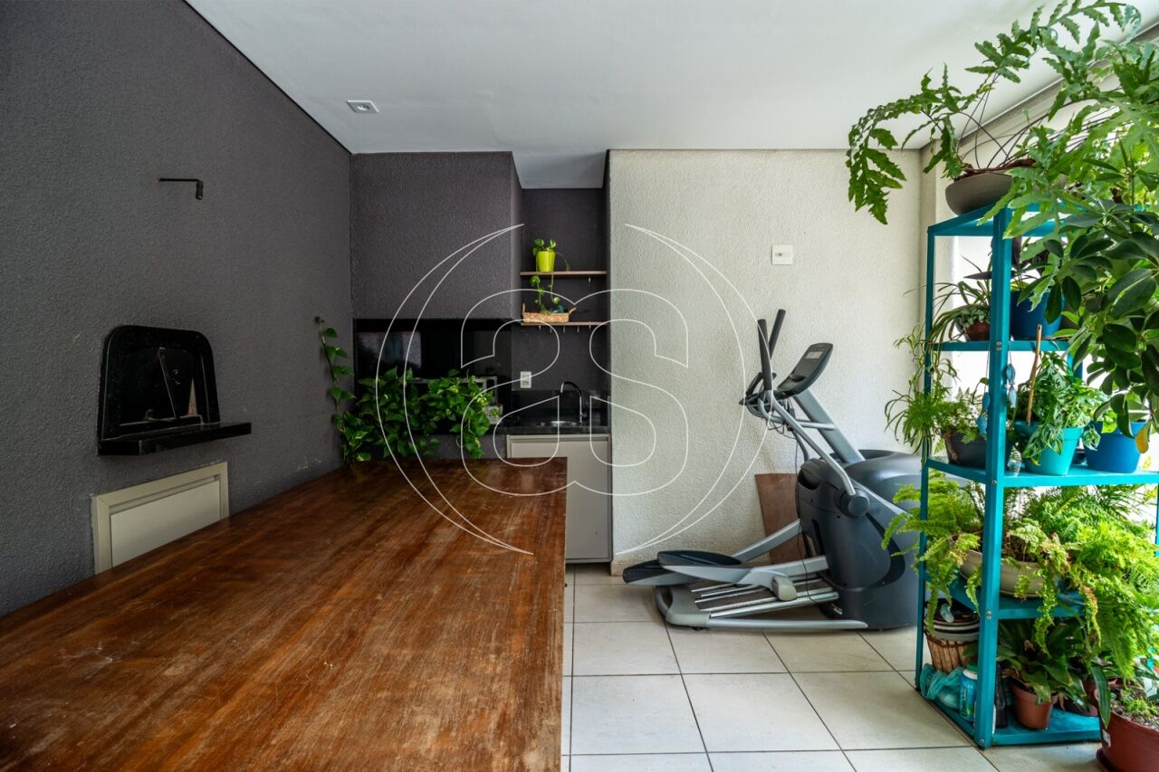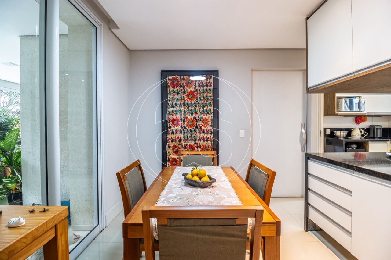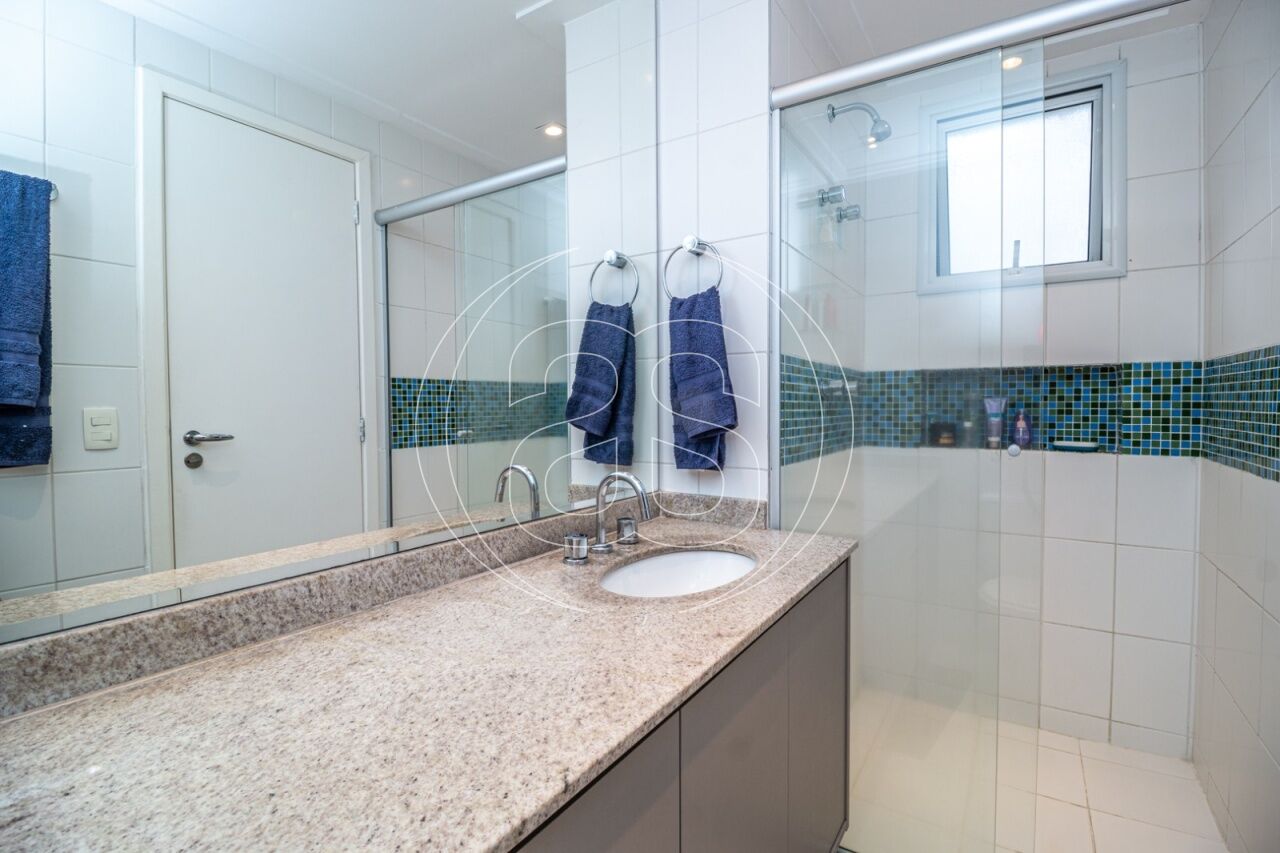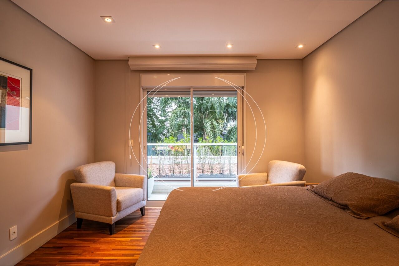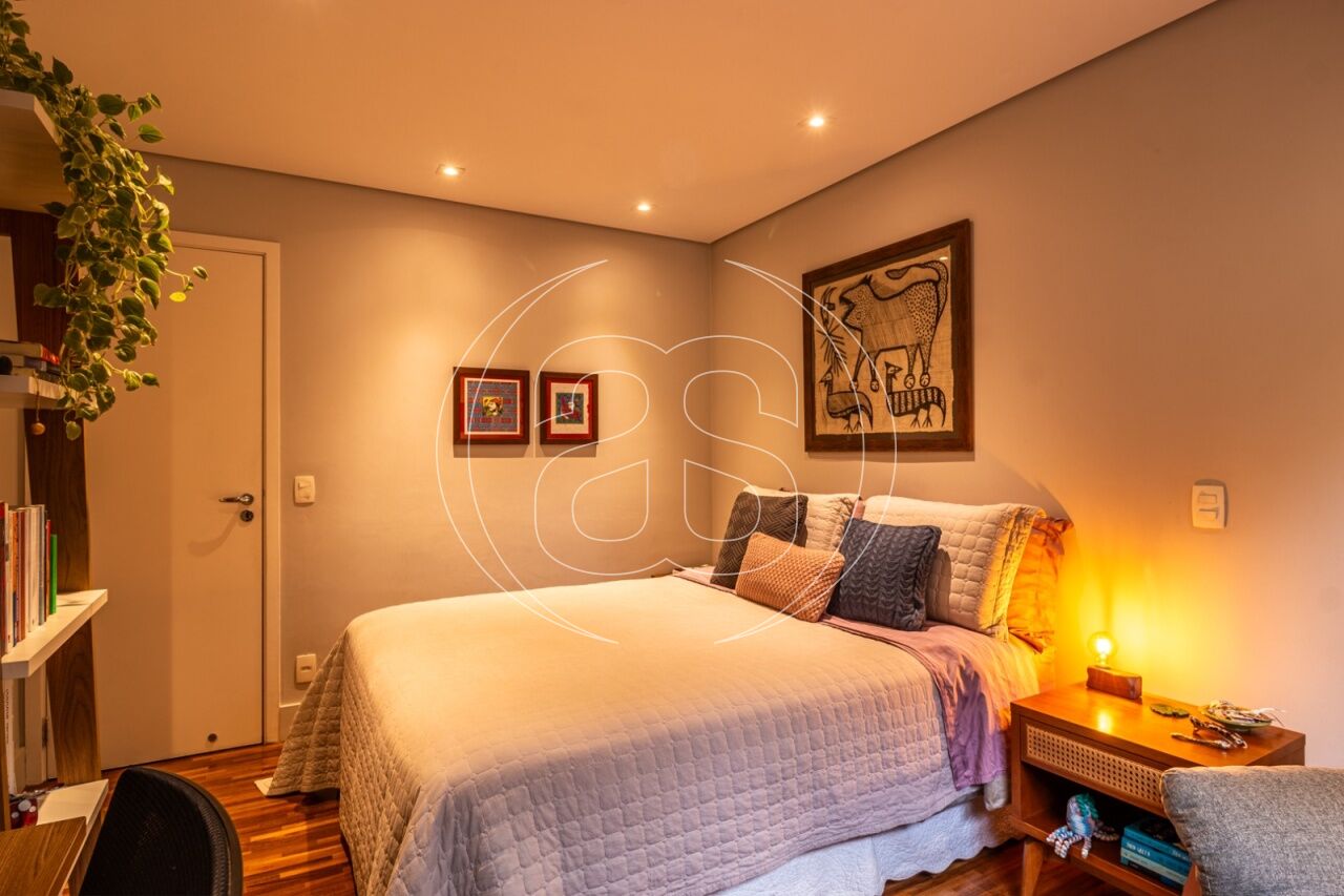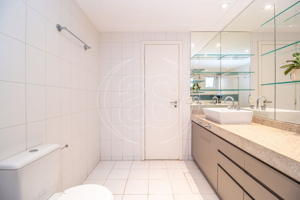 Extremamente silencioso e vista para a copa das árvores. Face norte nas varandas e em duas suítes. Decoração e iluminação de Joia Bergamo. Piso em taco palito, madeira Cumaru. Porta principal pivotante em laca. Hall do elevador, hall de entrada e lavabo com piso mármore crema marfil . Duas portas de correr em laca separando a sala de jantar da copa e o hall da ala intima. Armários sob medida (projeto Joia Bergamo) nas 4 suítes, 4 banheiros, sala de TV, copa, cozinha, lavanderia, rouparia e despensa . Alto-falantes embutidos no teto da sala e sacada com fiação instalada. Balcão em granito São Gabriel na copa, cozinha, lavanderia e churrasqueira/forno de pizza, com sistema de exaustão próprio. Armários junto à churrasqueira + depósito de lenha para o forn . Varandas totalmente envidraçadas, sistema europeu. Ar condicionado split quente e frio nas 4 suítes e sala íntima (Inverter Fujitsu). Espelhos em todos os banheiros, lavabo, closet e corredor. Persiana romana na sala íntima.