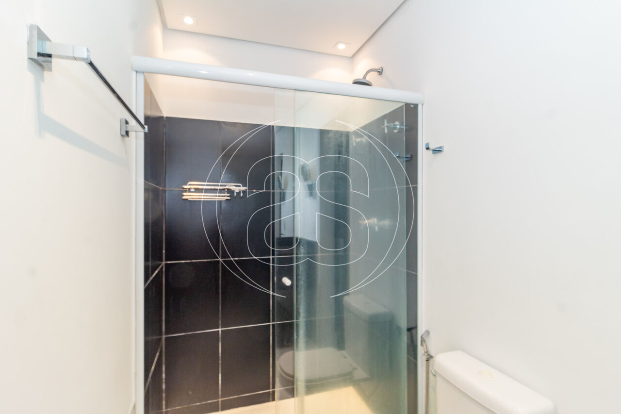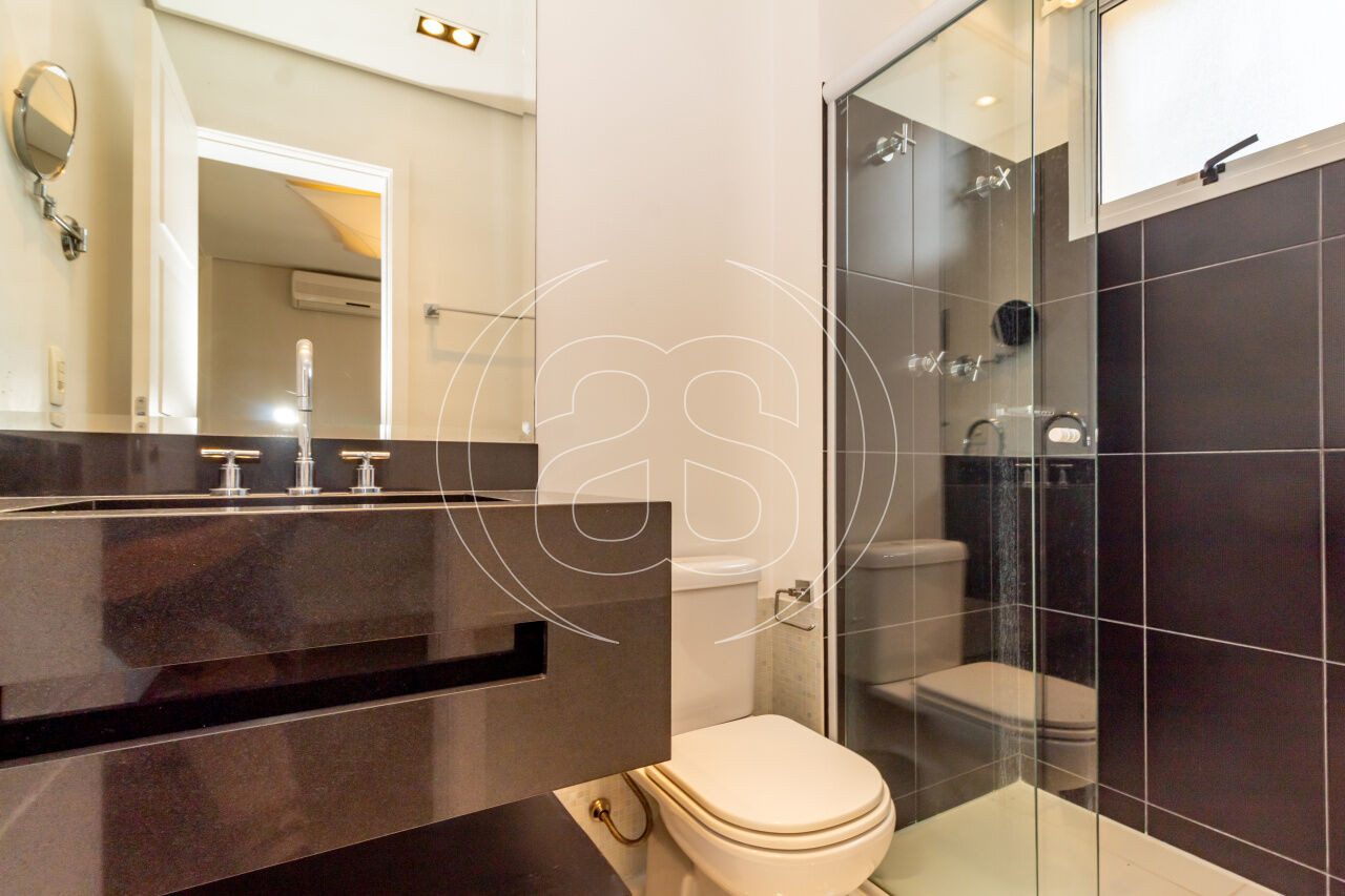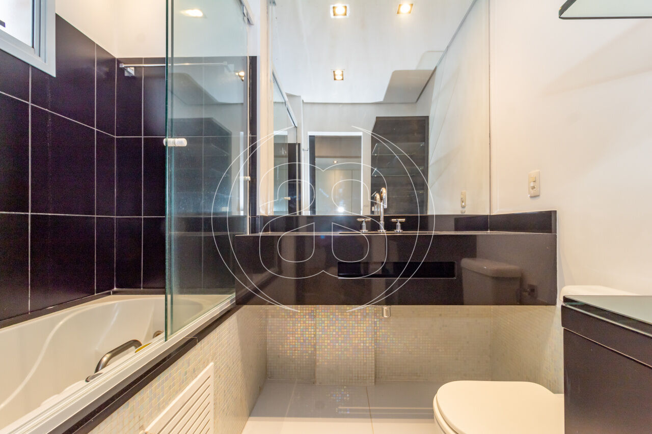 Banheiros com armário, um deles com banheira hidromassagem, box blindex e ambos com bancada de granito preto absoluto.